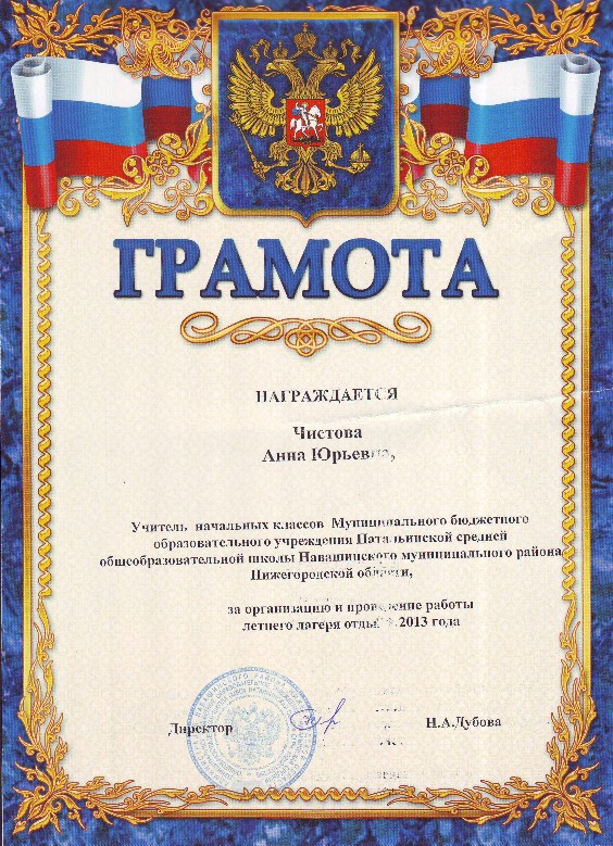 Грамота за организацию и проведение работы летнего лагеря отдыха 2013 года